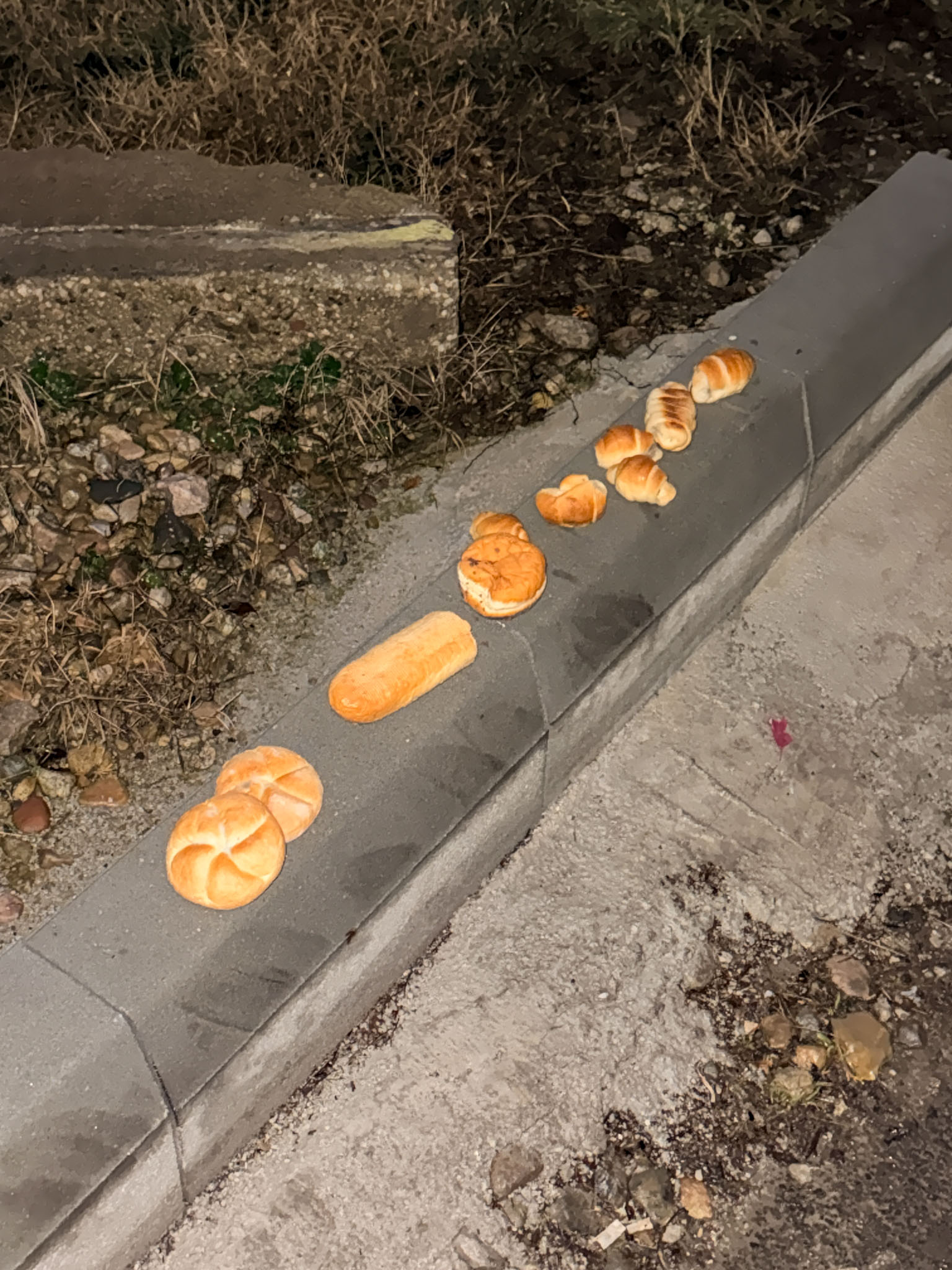 Most recently, on another walk with Josi, I found a row of buns placed on the curb. Seems deliberate.